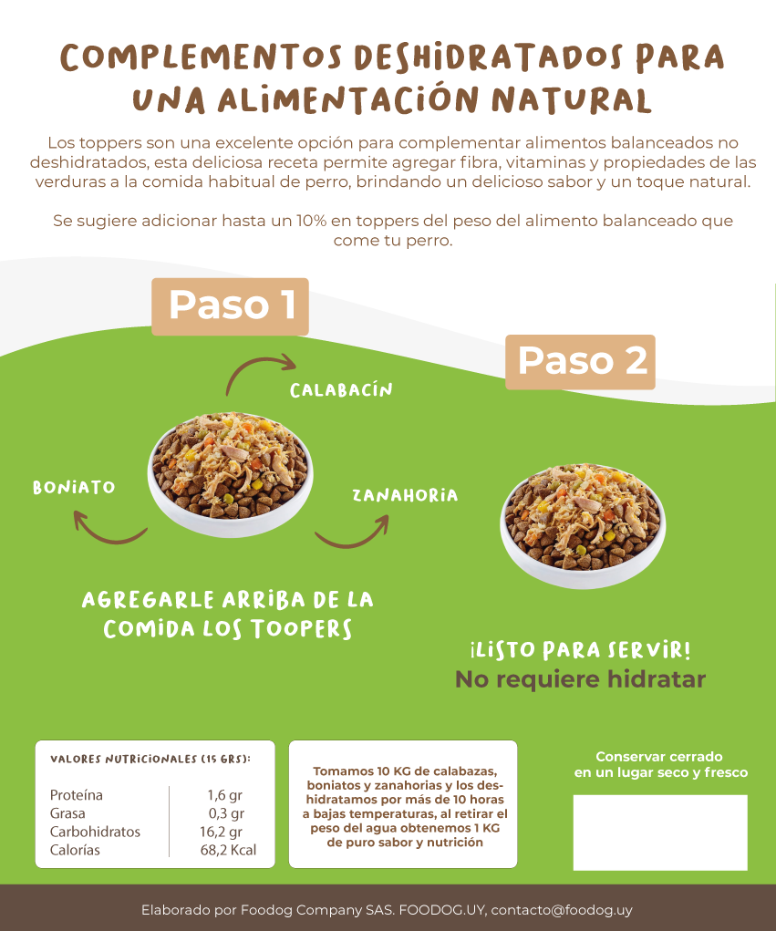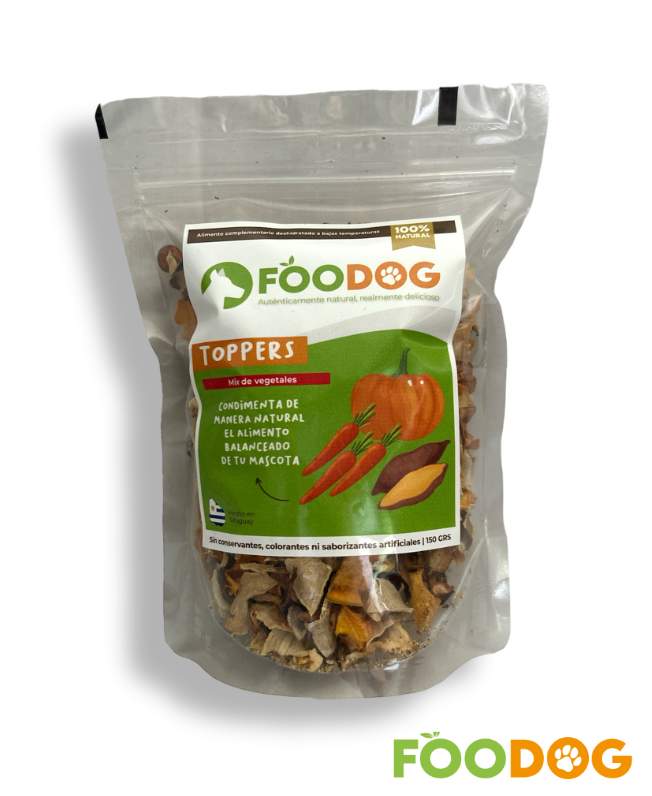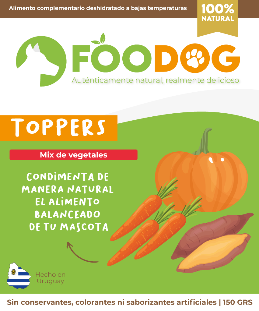 Complementá los alimentos secos tradicionales con nuestros Toppers de Vegetales que no solo permite agregar un rico sabor sino que aporta fibras, vitaminas y las propiedades de las verduras que tu perro necesita para fortalecer su pelaje y sistema inmune.