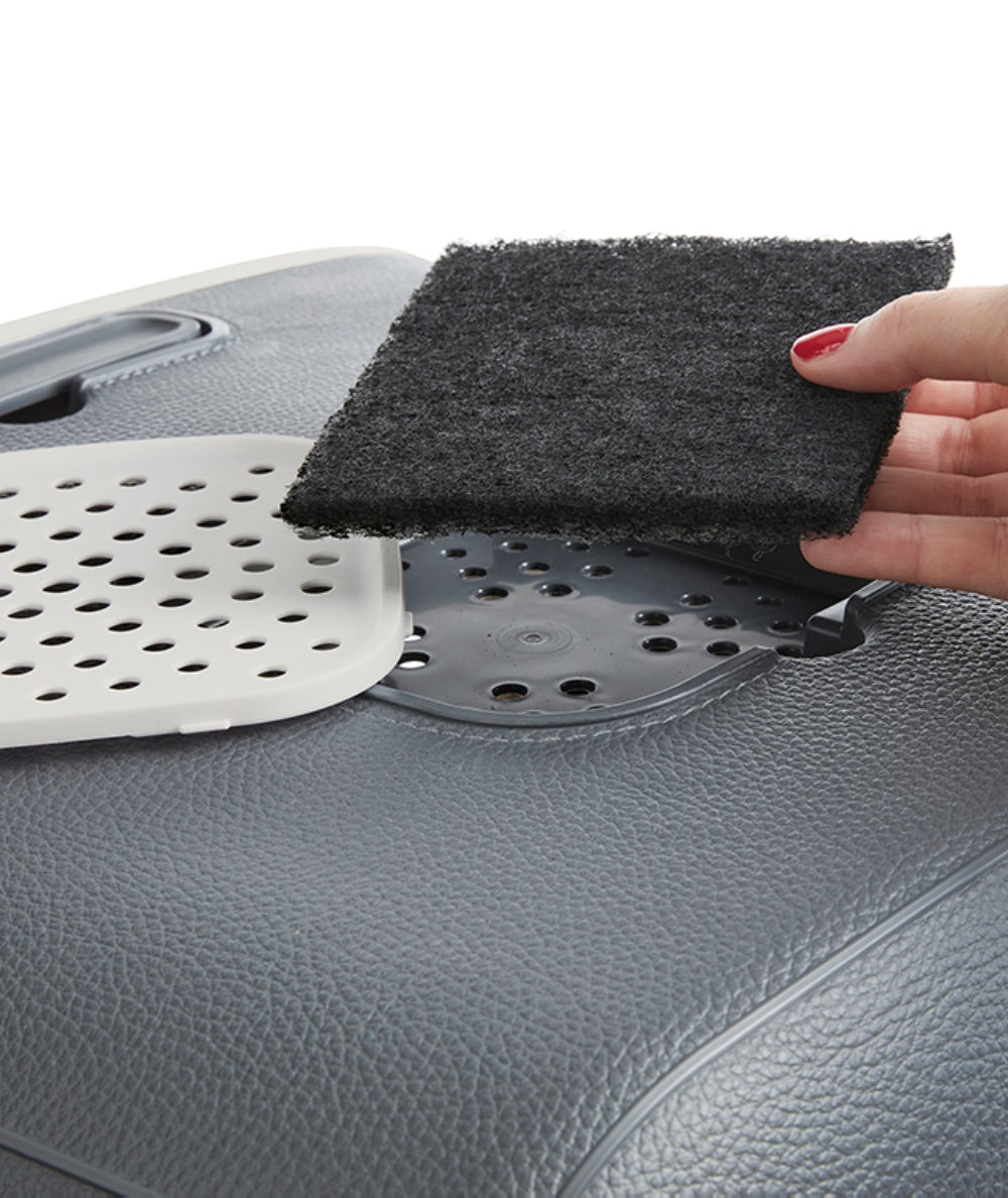 El filtro de carbón de alto rendimiento funciona 5 veces mejor que el filtro de una caja de arena normal, por lo que no te molestarán los olores desagradables en la casa. Y gracias a los pies antideslizantes debajo de las cuatro patas, el inodoro permanece en su lugar y el suelo no se raya.