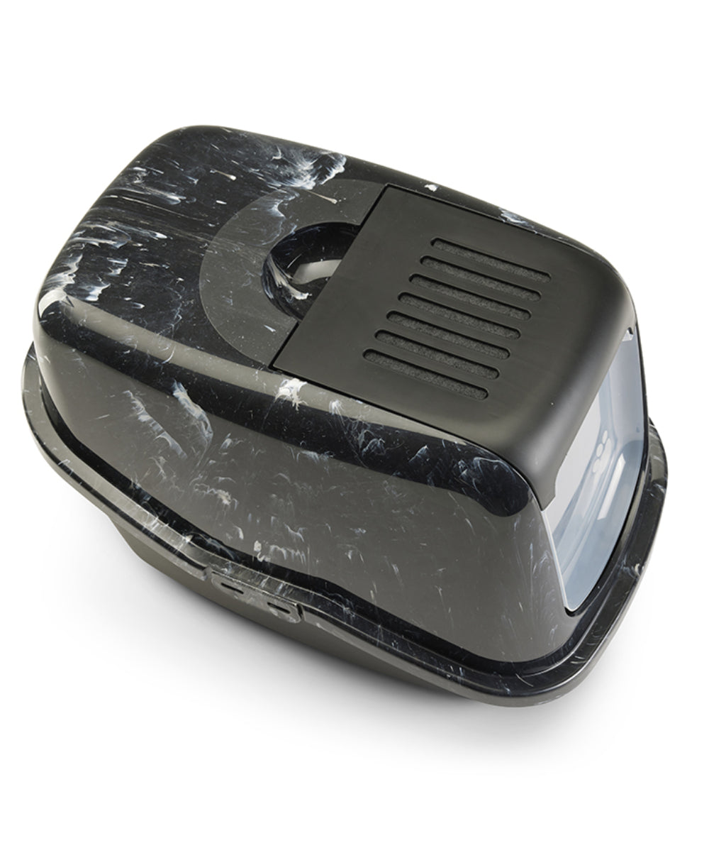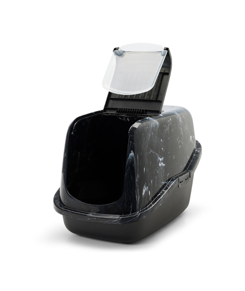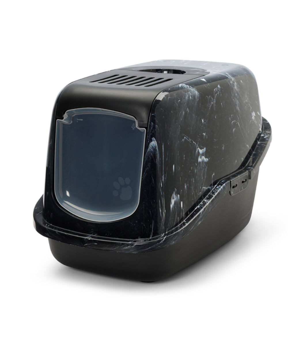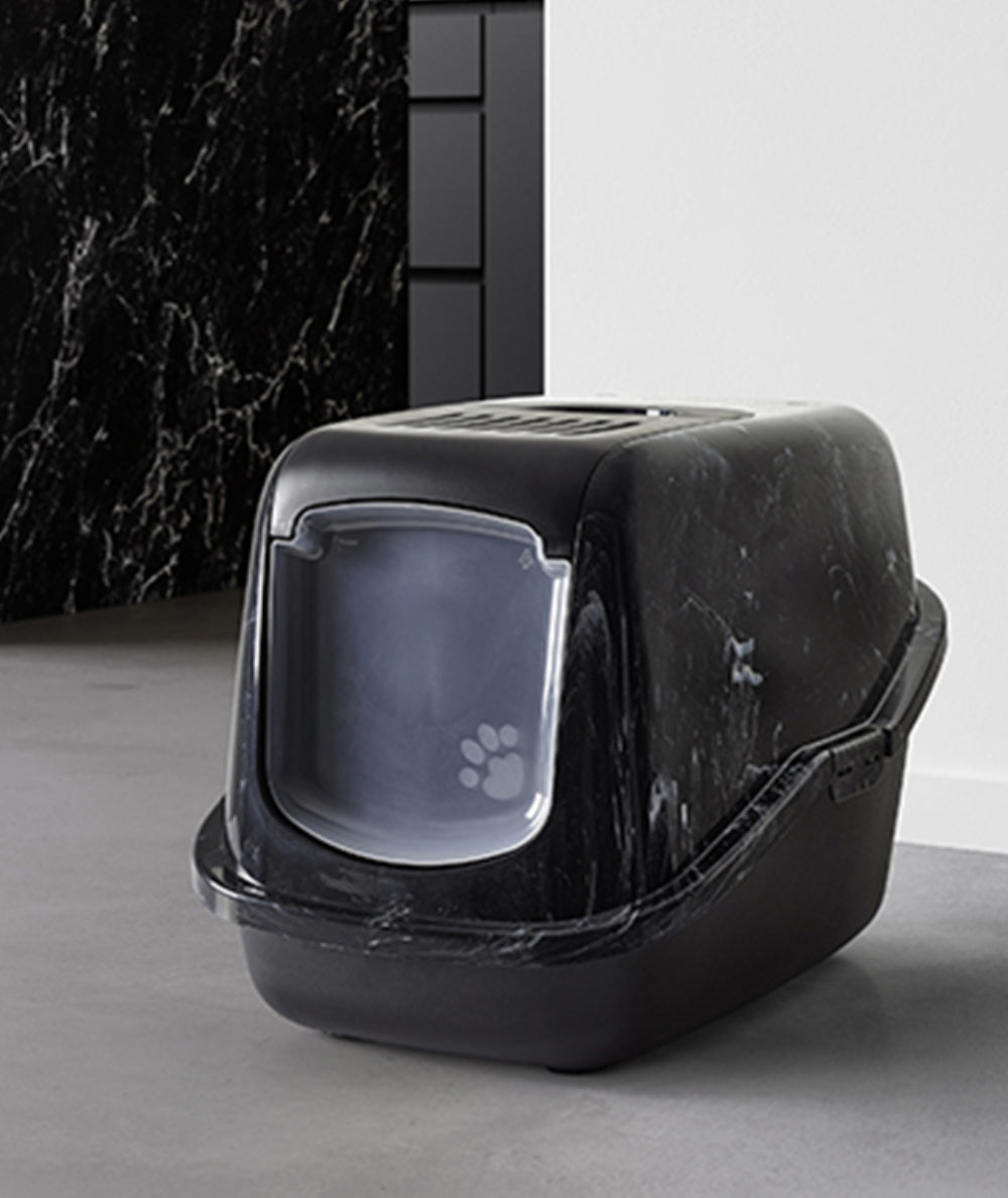 Combine perfectamente el inodoro doméstico Nestor Marble para su gato con su interior de forma sutil. Limpieza fácil y rápida gracias al frontal abatible. El frente especialmente desarrollado se abre ampliamente, lo que permite retirar la arena para gatos sucia de forma cuidadosa y rápida sin quitar la parte superior. La bandeja del Nestor tiene un respaldo elevado que evita fugas, un asa incorporada, una puerta batiente de plástico y un filtro de carbón.