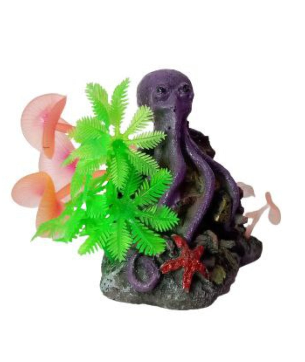 Si estás buscando añadir un toque de originalidad y diversión a tu acuario, te recomendamos nuestra decoración de un pulpo en un suelo marino con plantas y corales. Este accesorio es perfecto para darle vida a tu acuario y crear un ambiente natural y relajante.