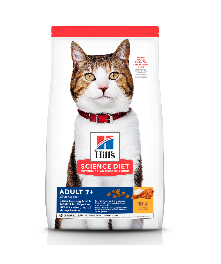 Hill's™ Science Plan™ ALIMENTO PARA GATOS MAYORES con POLLO (pollo 13%; total ave 20%) es un alimento completo para gatos desde los 7 años de edad.