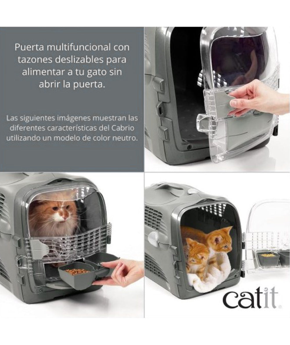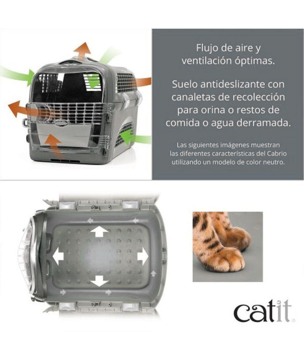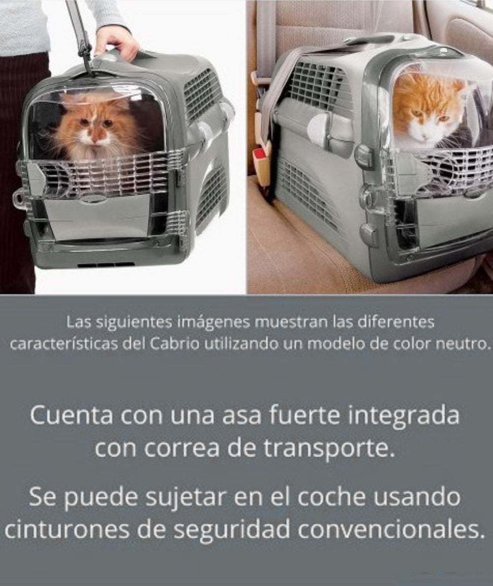 El Transportín Catit Cabrio está especialmente diseñado para los gatos, por lo que le brinda toda la comodidad y seguridad que necesita. Está diseñado también para que pueda ser asegurado a tu vehículo con un cinturón de seguridad convencional. Además, el acceso al comedor es externo para una mayor comodidad y para reducir el riesgo de que tu gato escape. Cuenta también con un piso texturizado antideslizante que ayuda a evitar que las mascotas se deslicen durante el transporte. También el mango del transportin es moldeado a tu mano para ayudar a reducir el mareo causado por el movimiento.