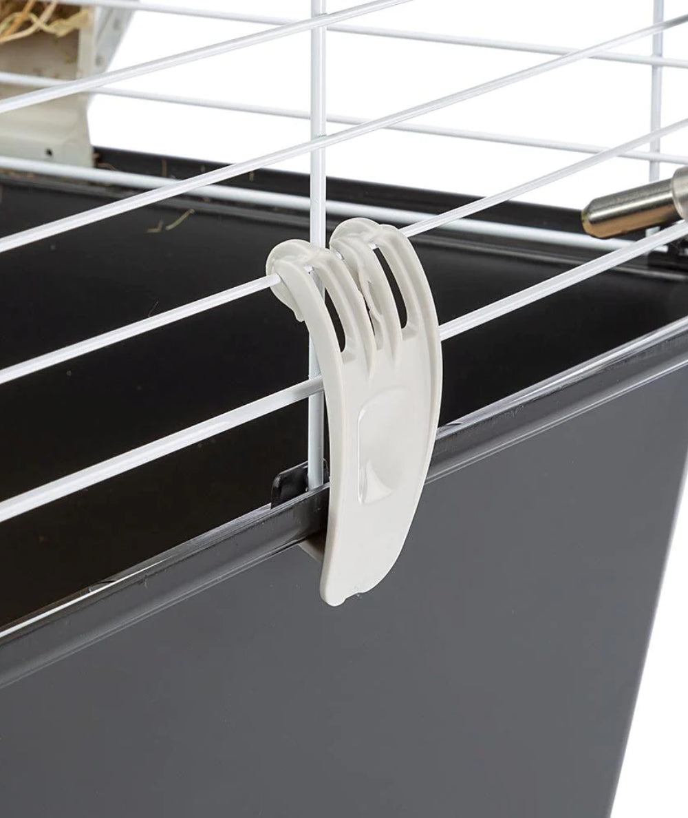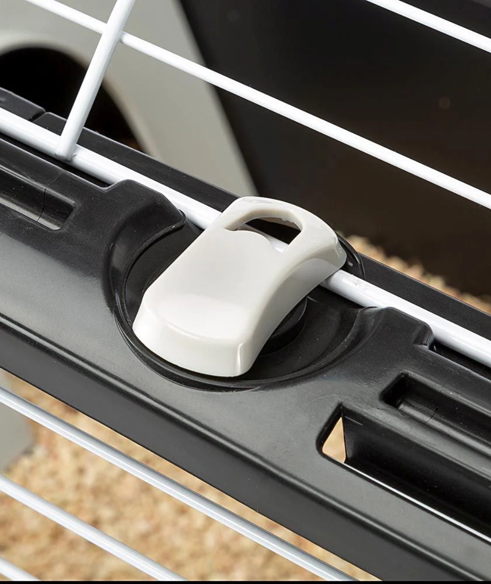 Esta jaula es muy fácil de limpiar: simplemente abre el techo y podrás alcanzar todas las partes que necesitan una limpieza más profunda. Gracias al sistema Save Space, Casita se puede desmontar por completo.