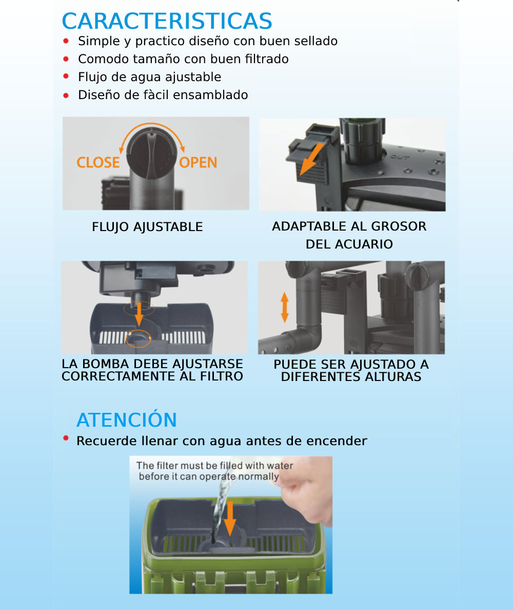 Filtro externo canister mochila, flujo ajustable, múltiple filtrado, para acuario.