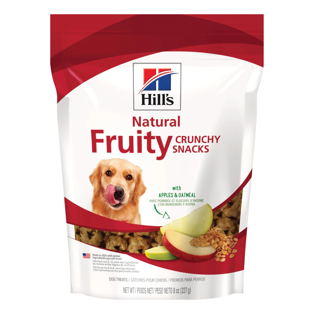 Hill's® Natural Fruity Crunchy Snacks with Apples Oatmeal son deliciosos premios naturales para perros hechos con solamente los mejores ingredientes. Cada premio está horneado con pedazos de fruta verdadera y hará feliz a su perro. Sin conservadores o saborizantes artificiales.